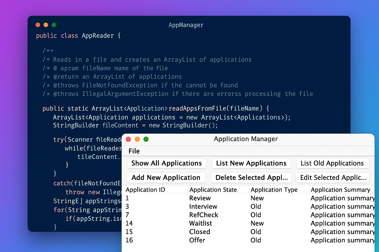 Java app to manage faculty/staff job applications. It uses the State Pattern with a finite-state machine to model each application’s lifecycle, enforcing state-specific rules and logging transitions.