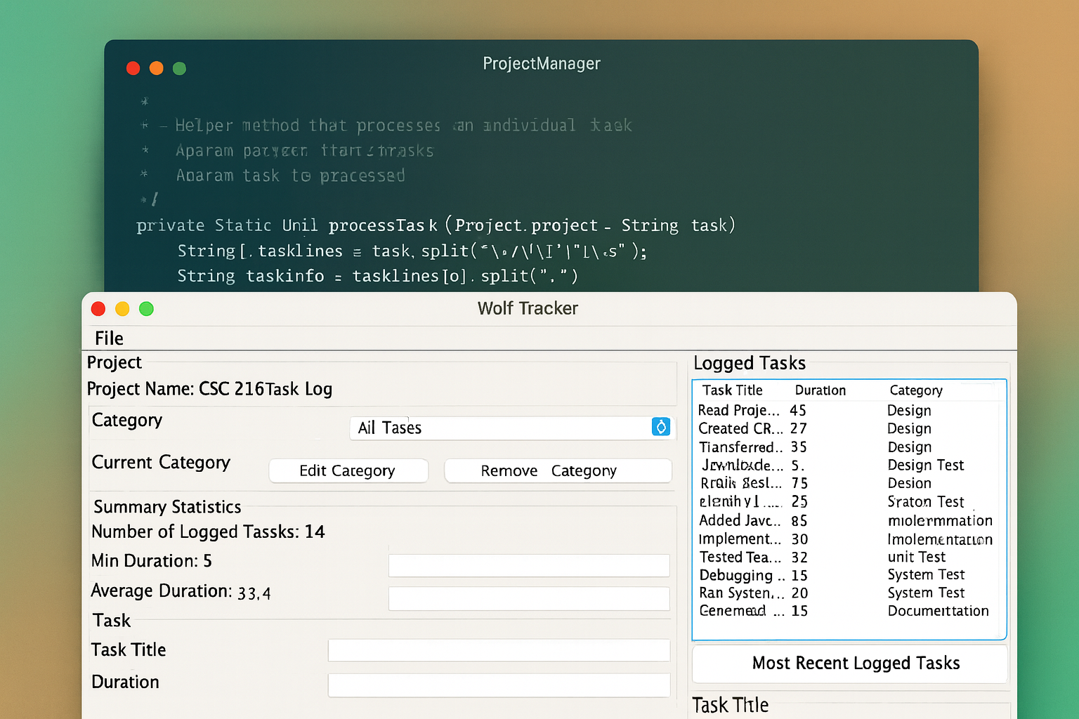Java desktop task logger organized by category. Manage categories, then add tasks with a title, duration, and description. A “Logged Tasks” table lists entries for editing/removal, and a Summary panel shows totals with min/max/average durations.